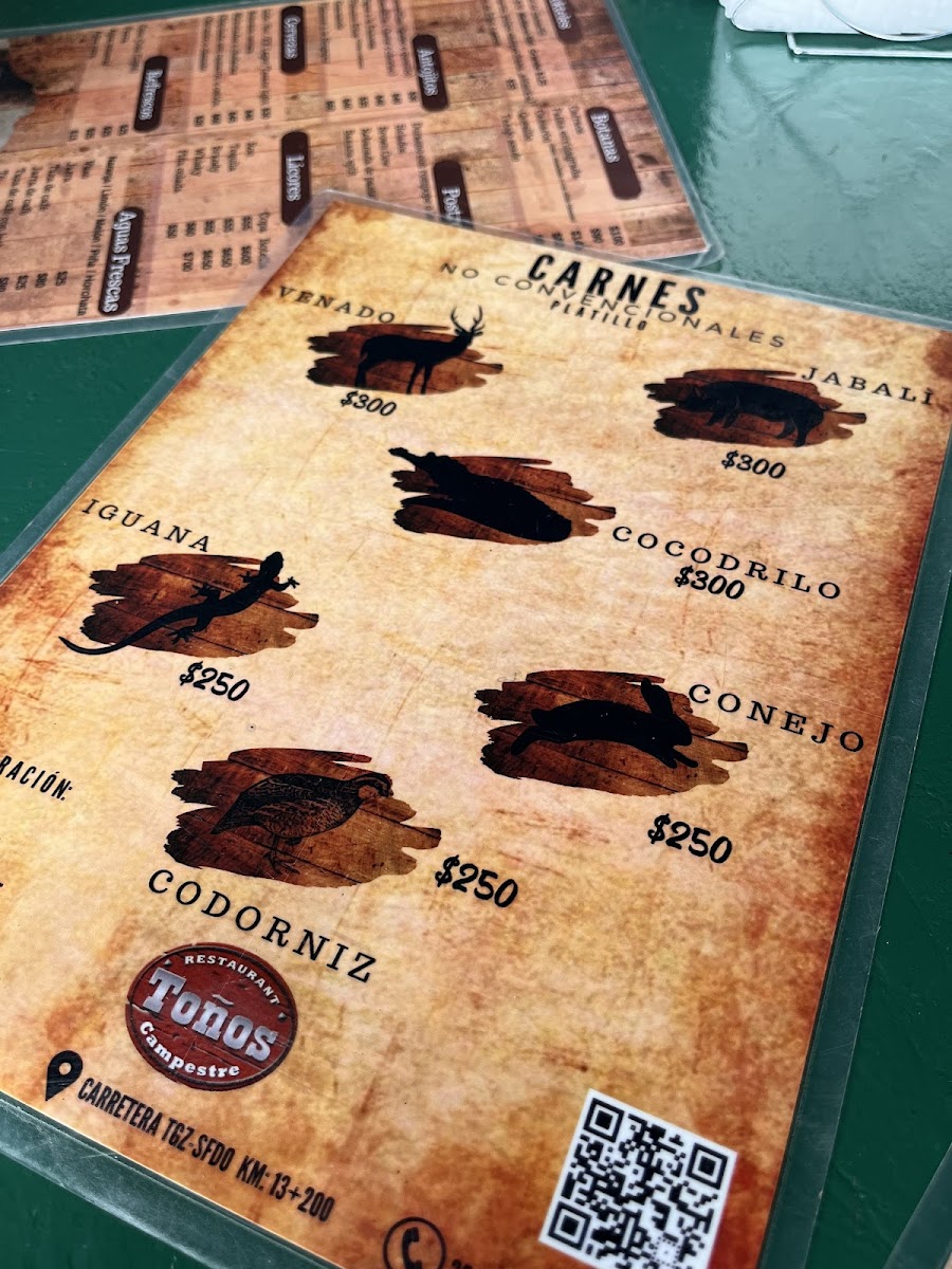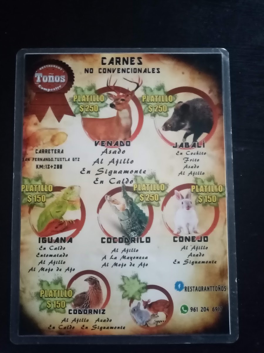 Welcome to Restaurant Toños Campestre, a unique dining experience nestled in the heart of Tuxtla Gutiérrez. Known for its authentic Chiapanecan cuisine, the menu boasts a tantalizing array of exotic delicacies, including jabalí, iguana, and even crocodile, appealing to adventurous palates.